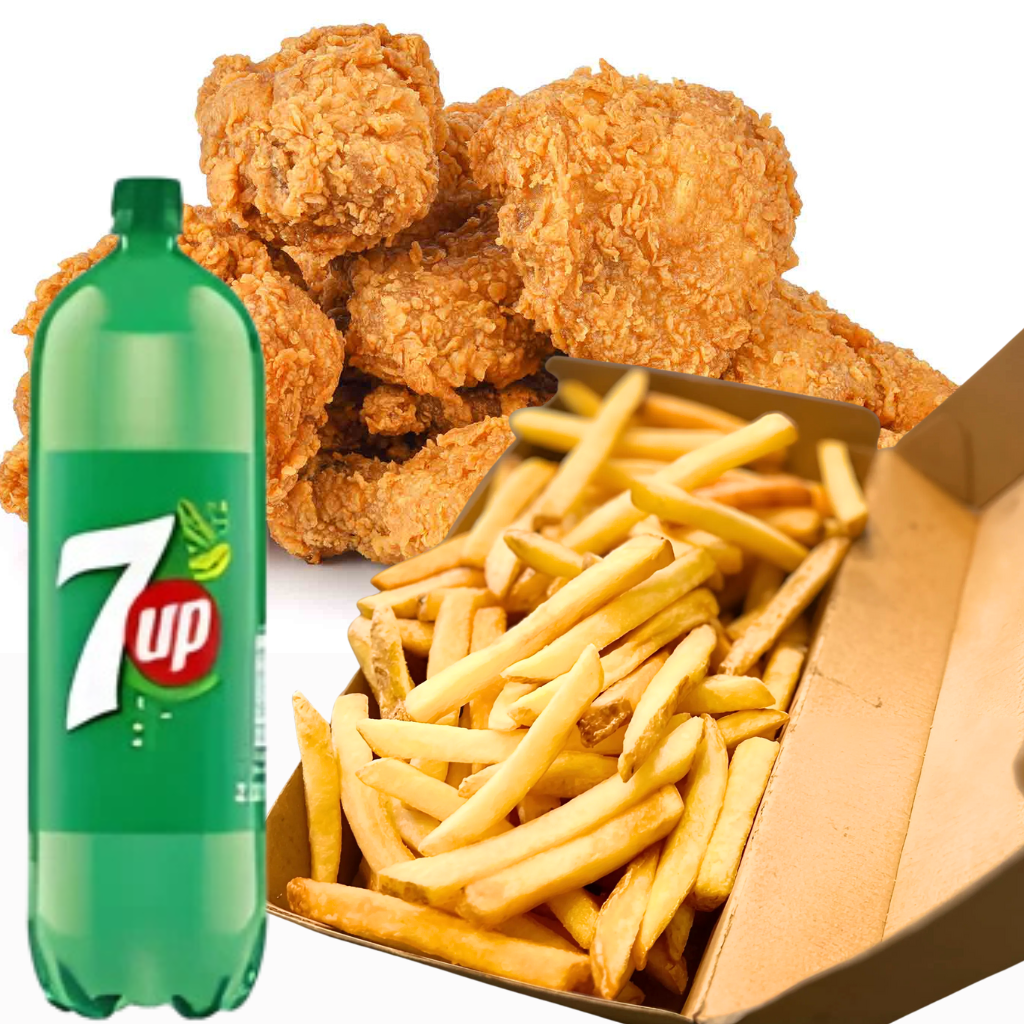 12 crispy fried chicken pieces, golden fries, and a 2L drink of your choice (Coca-Cola, Sprite, or Tango). The ultimate feast for family and friends!